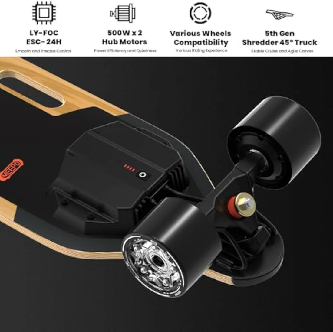 - [Hub Motors] The 500W*2 powerful hub motors on the MEEPO V5 electric skateboard give it a top speed of 28 mph and a range of 11 miles, allowing it to adapt to various scenarios like college commuting, hanging out with friends, or riding around the city