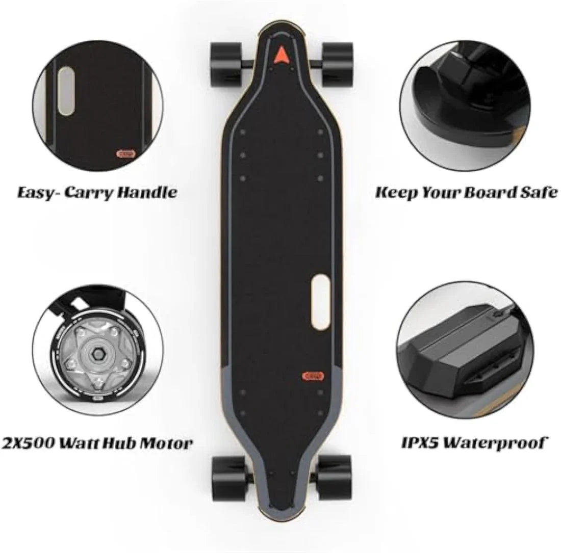 - [Smooth Braking and Modes] Riders benefit from a smooth braking experience due to the new ESC's sensitive M5 remote control system. The board is also IPX5 waterproof and has 4 settings, including an easy-to-use LO mode, that you may switch between to suit your daily activities